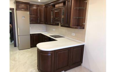 - Светлая столешница на фоне тёмной деревянной мебели создаёт эффект «лёгкости» и контраста, делая кухню визуально более просторной.