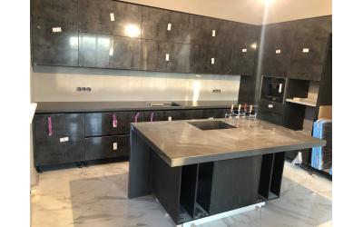 Кухонный остров с двумя уровнями рабочих поверхностей, выполненный из матового серого искусственного камня.
