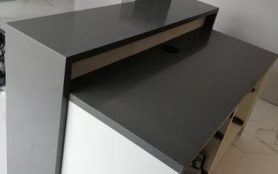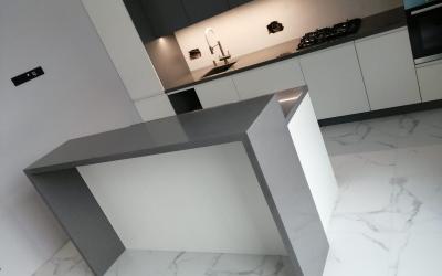 Кухонный остров с двумя уровнями рабочих поверхностей, выполненный из матового серого искусственного камня. Это не просто дополнение к интерьеру — это сердце кухни, где готовят, общаются, принимают гостей и даже работают. Такой остров — символ современного подхода к дизайну: эргономика, минимализм и безупречное качество исполнения.