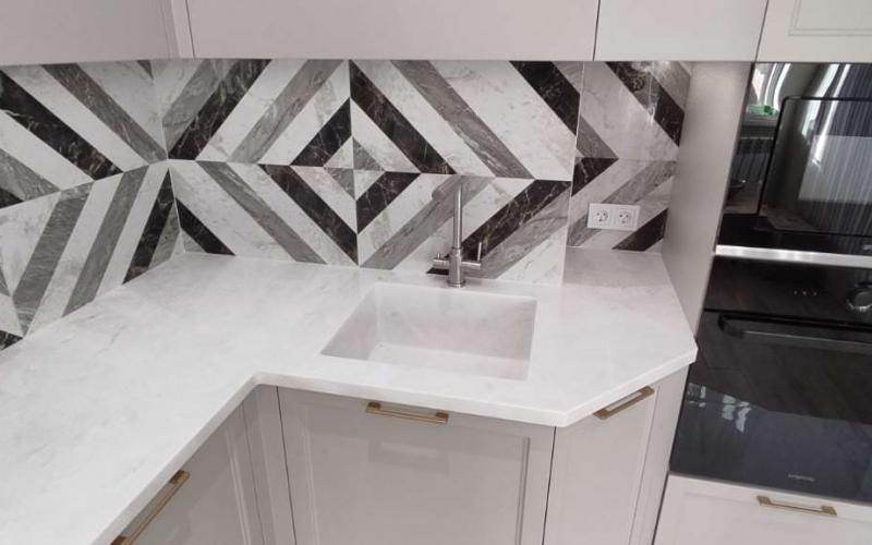 Изготовление кухонной столешницы из искусственного камня белого цвета