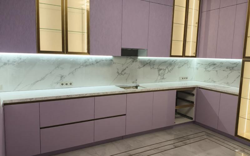 Бесшовная акриловая столешница. Фиолетовые фасады и мраморная текстура