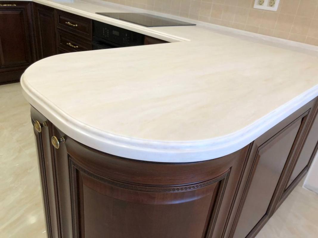 - Светлая столешница на фоне тёмной деревянной мебели создаёт эффект «лёгкости» и контраста, делая кухню визуально более просторной. Белая окантовка по краю («борт») добавляет объёма и акцентирует внимание на форме, подчёркивая ручную отделку и качество исполнения.