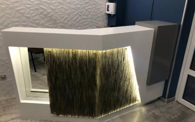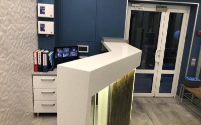 На фотографиях — современная стойка ресепшн, выполненная из белого искусственного камня с мелкозернистой текстурой, которая стала центральным элементом интерьера офиса или клиники. Это не просто рабочая поверхность для сотрудников — это визитная карточка вашего бизнеса, первое впечатление, которое оставляет посетитель при входе.