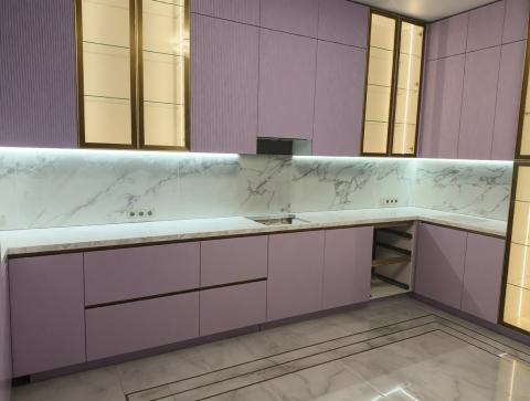 Компания "АкрилВДом" изготовила бесшовную столешницу для кухни. Кухня, в том числе изготовленная и компанией "АкрилВДом", действительно выглядит впечатляюще! Индивидуальный дизайн с плавными линиями, сочетание фиолетовых фасадов с мраморной текстурой и акцентной подсветкой создает современный и уютный интерьер. Бесшовная акриловая столешница не только подчеркивает эстетику, но и обеспечивает практичность в использовании — легко чистится и устойчива к повседневным нагрузкам. Такое решение идеально для тех, кто ценит гармонию стиля и функциональности в интерьере.